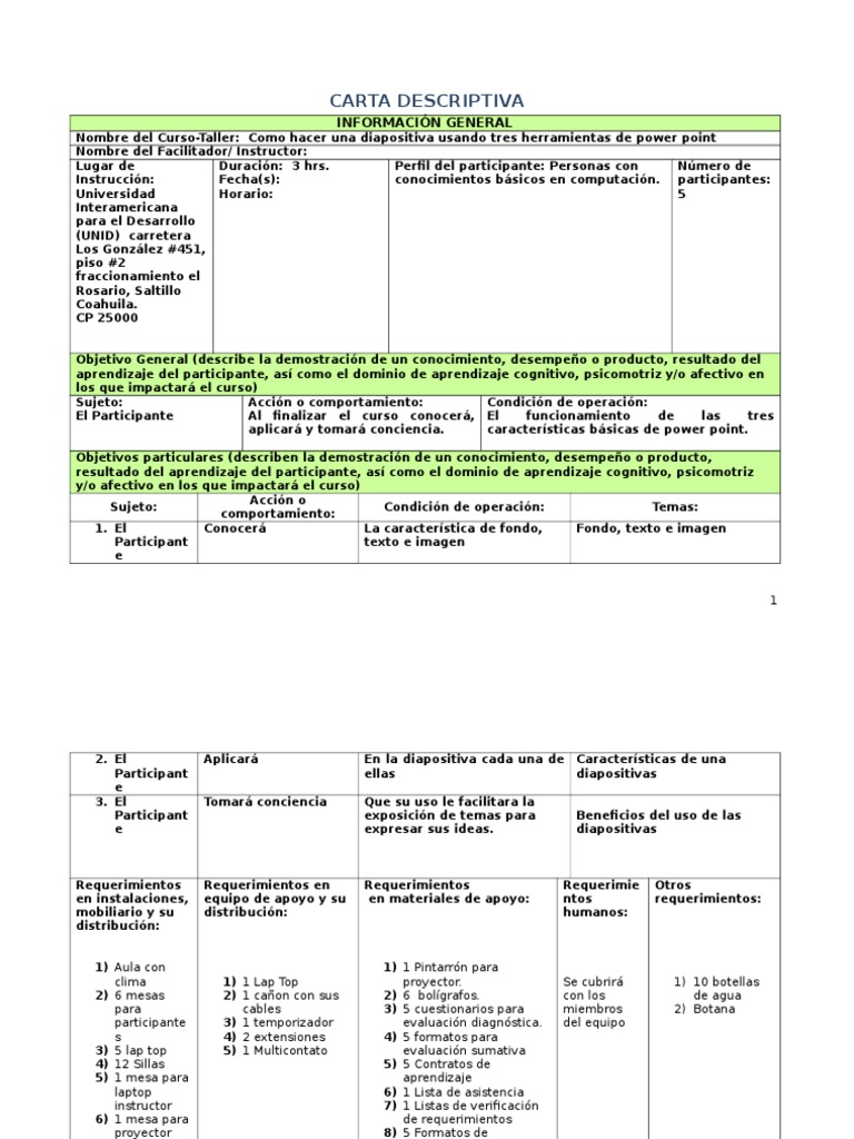 Que Es Una Carta Descriptiva : INTRODUCCIÓN A LA PSICOLOGÍA EDUCATIVA Carta descriptiva ... : Es la formulación que describe logros y conductas que se esperan de un sujeto, al concluir su aprendizaje.. Curso formación de instructores carta descriptiva o plan de acción. Analizar la importancia del uso. 1 parte 1 ¿qué es una carta descriptiva? Es una carta formal o documento donde se debe explicar de la manera más precisa posible, todas las etapas que forman parte de un proceso educativo sistematizado. Generalmente se usa un lenguaje coloquial que ambos.