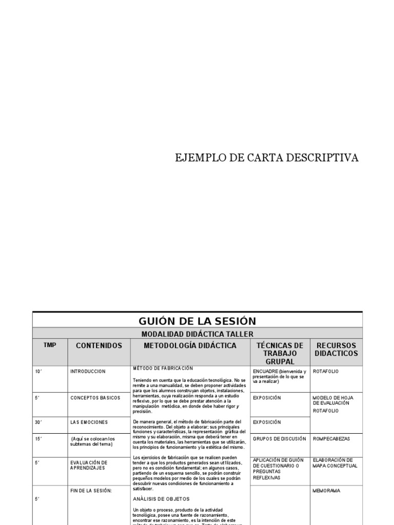 Carta Descriptiva from imgv2-2-f.scribdassets.com Elementos de la carta descriptiva la carta descriptiva de un curso es un documento en el que se identifica con la mayor precisión posible las etapas básicas de todo proceso sistematizados * la planeación * la realización * la evaluación la carta descriptiva es un curso en el cual debemos. La carta descriptiva es una guía que permite al instructor y al participante llevar a cabo el curso con los contenidos y tiempos programados, además de cubrir los objetivos y las expectativas de los participantes. Asignatura código prerequisito horas créditos area. By javier solis noyola 2260 views. Cartas la carta descriptiva de un curso es un documento en el que se descriptivas indican, con la mayor precisión posible, las etapas básicas de todo proceso sistematizado. Si escribes a un amigo o a un familiar cercano, un correo electrónico o una carta una carta escrita al estar enojado o para pedir compasión probablemente no sea una carta que debas enviar. Si no es el caso, una carta escrita a mano es una opción más segura. 1 parte 1 ¿qué es una carta descriptiva?